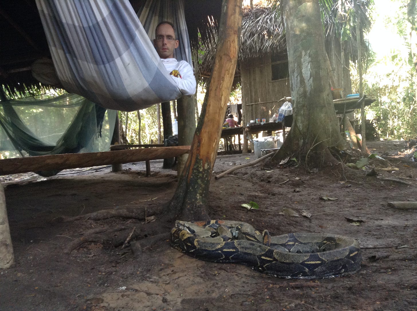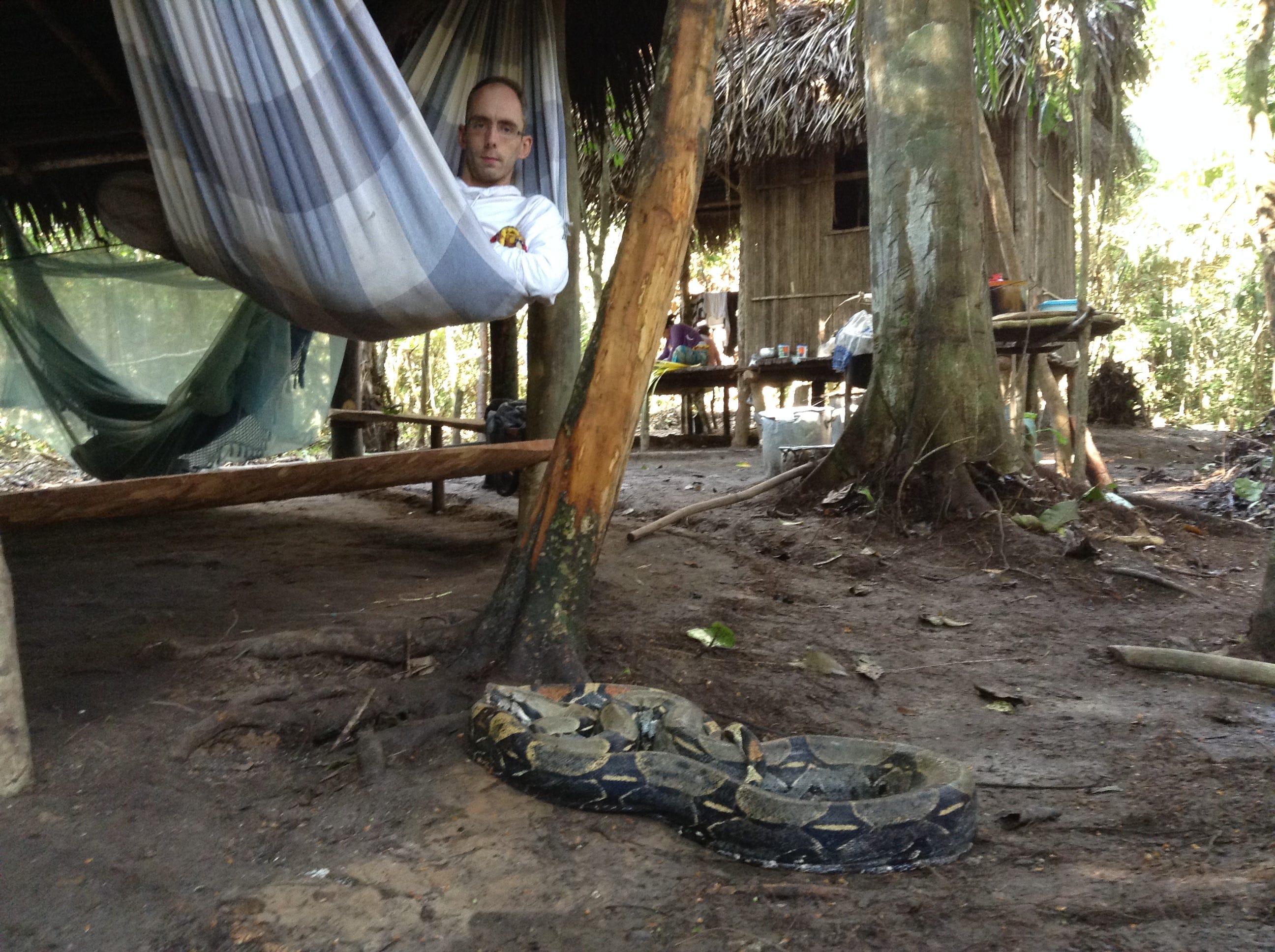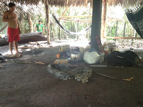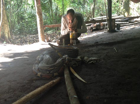 Ffffwwwpppp! I blew the rapé into his nose while my hand was on the cobra, touching the body of that beautiful creature. Then Muca and I exchanged the applicator and rapé bottle, and he blew the medicine into my nose. There I was, sitting, touching the serpent, slowly drifting into the deep forest of rapé. I went deep into the arms of that medicine. We stayed in silence for a while, my hands still on Nalini.