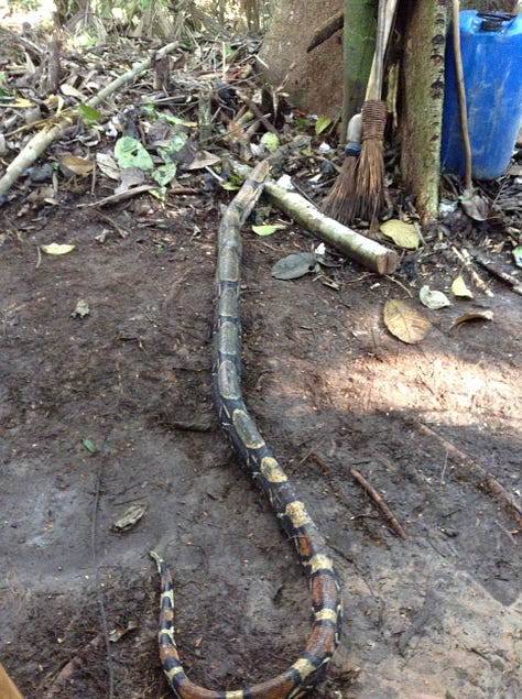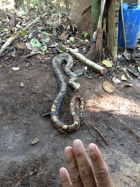 Her body was very thick, bigger than any snake I had seen in my life, covered in beautiful colors. I felt terrified, but I could not help but look at her in awe. She looked straight into my eyes, and I looked straight back. Luis hadn’t seen her at first, and even he looked a bit scared. He watched from a distance. Later, he confessed that he almost stepped on her as well.