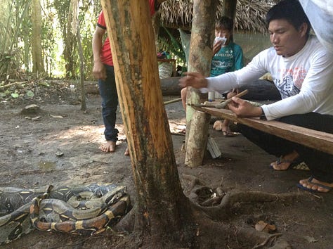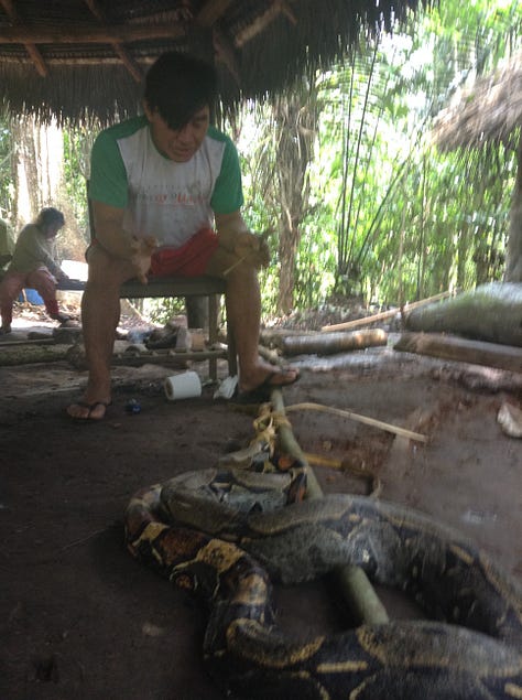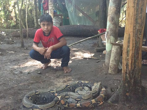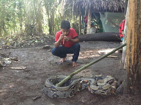 “If you meet a Runūa, you must take time. Whatever you are doing, stop doing it. Just pause, and sit down to be with the animal. Take some rapé, the snuff made of tobacco and the bark of a tree. Rapé is the medicine of the Runūa. Take your time. She will not go anywhere. Sit close to her and take a stick. With that stick, tap her body very gently. Look her in the eyes, and ask the serpent for its blessings. At that moment, tapping the serpent’s body with your stick, you speak the intentions for your life. But be wise: whatever you ask the Runūa for in that moment, you will receive.