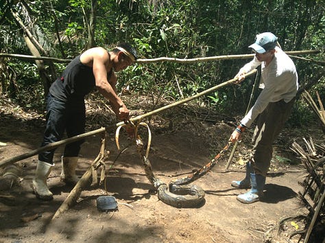 I prepared to transport Nalini to the temple. I found a strong, long branch with a V-shape at the end. I also took a straight branch and collected some small vines to use as ropes. Standing in front of her, with the V-shaped branch in my hands, I looked into her eyes: “Nalini, I’m going to catch you.” I told her out loud, “I’m not going to hurt you. I’m not going to kill you. I’m just going to take you. So please, Nalini, relax.”