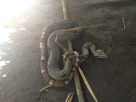 I stood right in front of her with the branch in my hand. I took some time to gather my courage. When I felt ready, I pinned her neck to the ground with a strong, swift movement. Both sides of the V-shaped end were on either side of her head, so she was unable to move her neck and head. As I did this, I stood just half a meter in front of her head, still looking her straight in the eyes. She went into a fit, thrashing and hissing. She slapped and whipped her tail around. She could easily have knocked me out with her tail, I realized later. She resisted so much, but I just stood there, holding the branch down, pinning her to the ground with all my force.